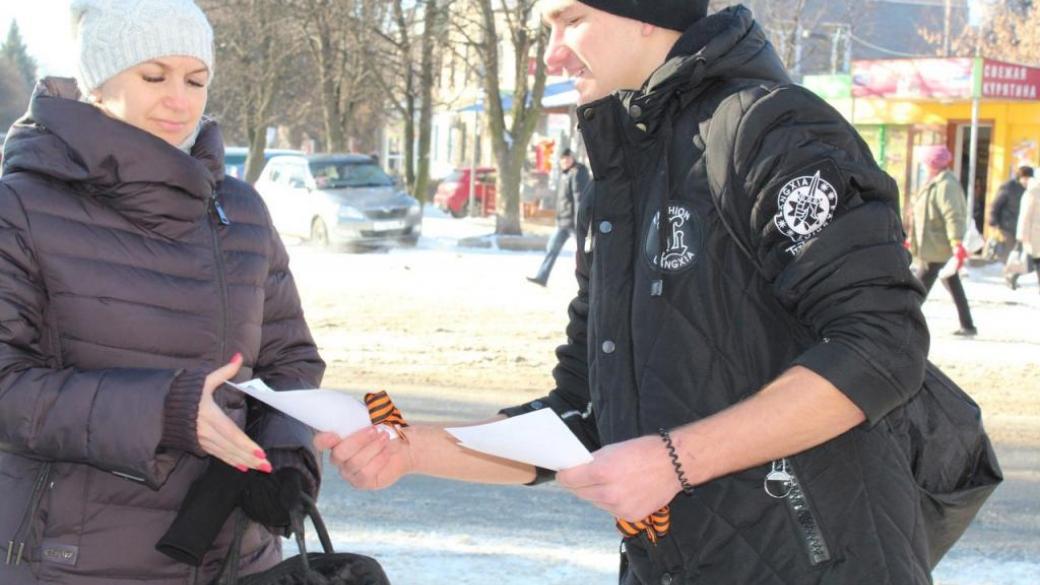 «К листовке прикреплена Георгиевская лента, чтобы люди, принявшие участие в акции, могли носить ее на груди в память о мужественных поступках наших предков», — сказано в публикации.