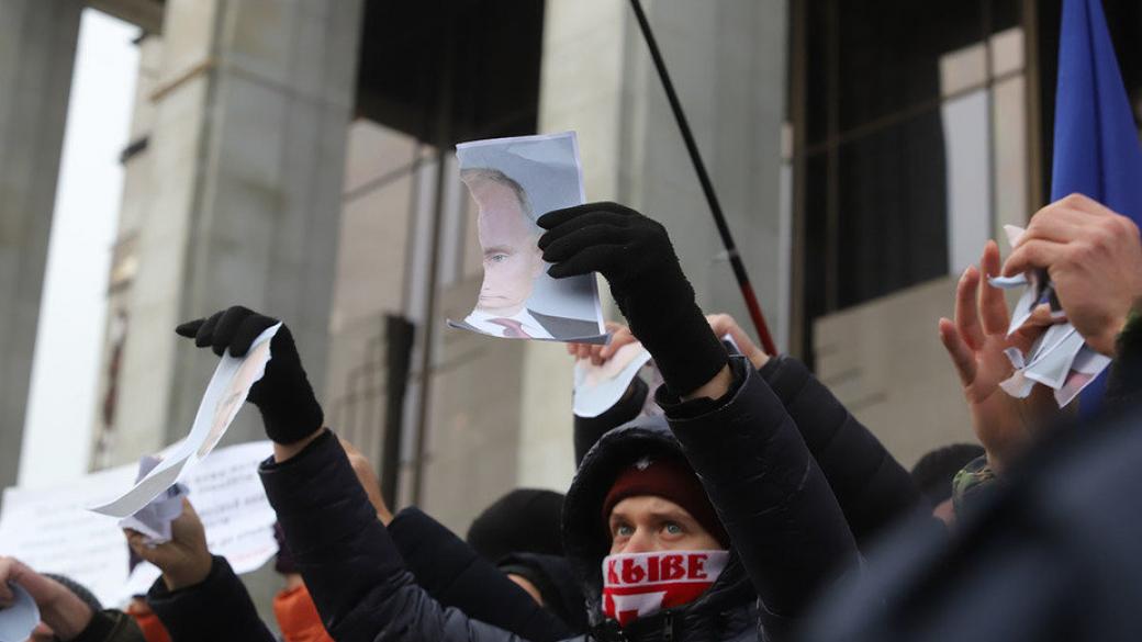 В воскресенье 7 декабря, в Минске на акции протеста против интеграции с Россией порвали портрет Путина. Об этом пишет Хартыя'97.