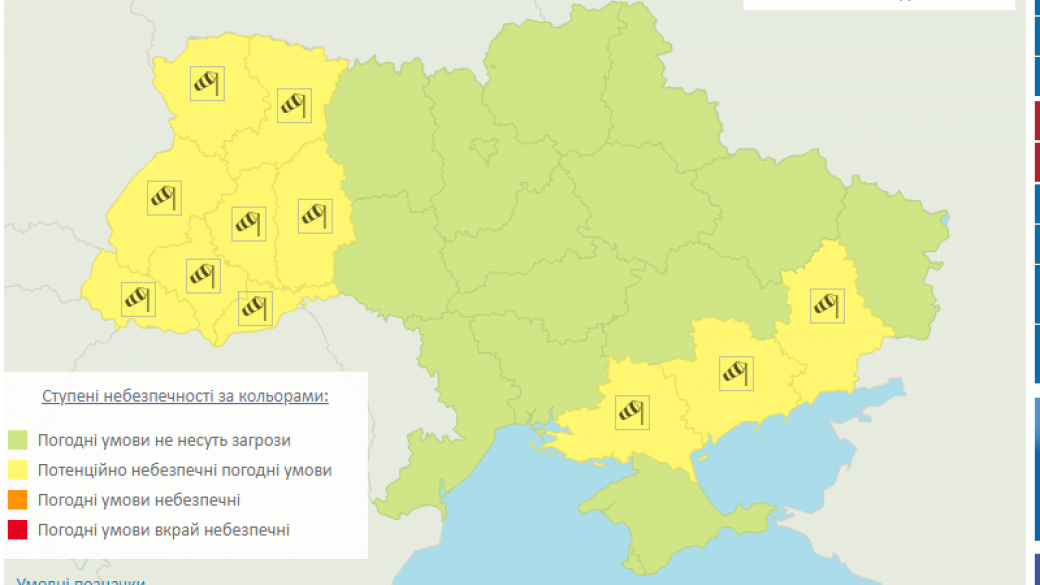 При этом в западных областях и Приазовье порывы ветра 17−22 м/с (I уровень опасности, желтый).