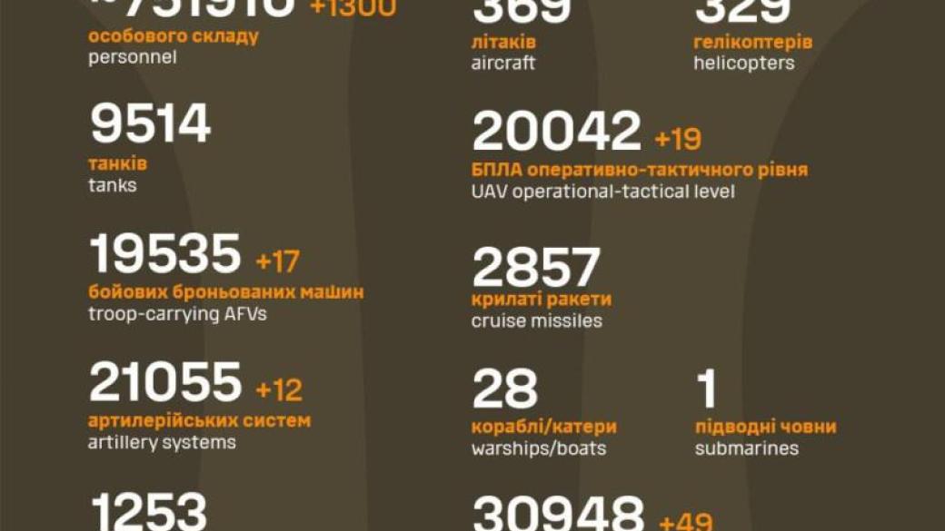 За минувшие сутки Силы обороны Украины уничтожили 1300 оккупантов и десятки единиц техники врага.