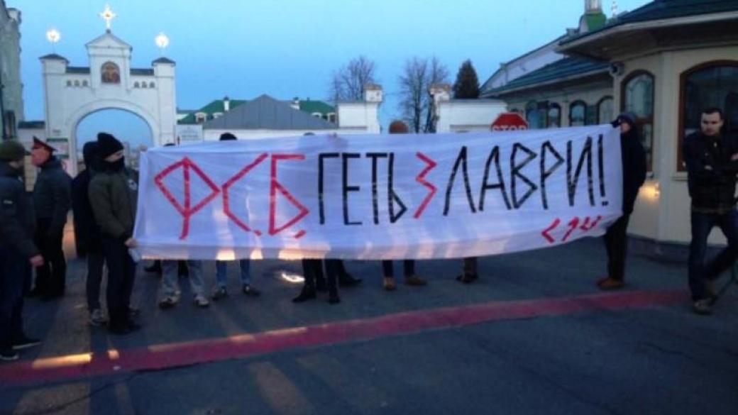 На странице в соцсети общественной организации «С14» собщается, что представители националистической организации протестуют «против ФСБ» и отказа священников отпевать погибших украинских военных и гражданских лиц, крещеных не в церкви Московского патриархата.