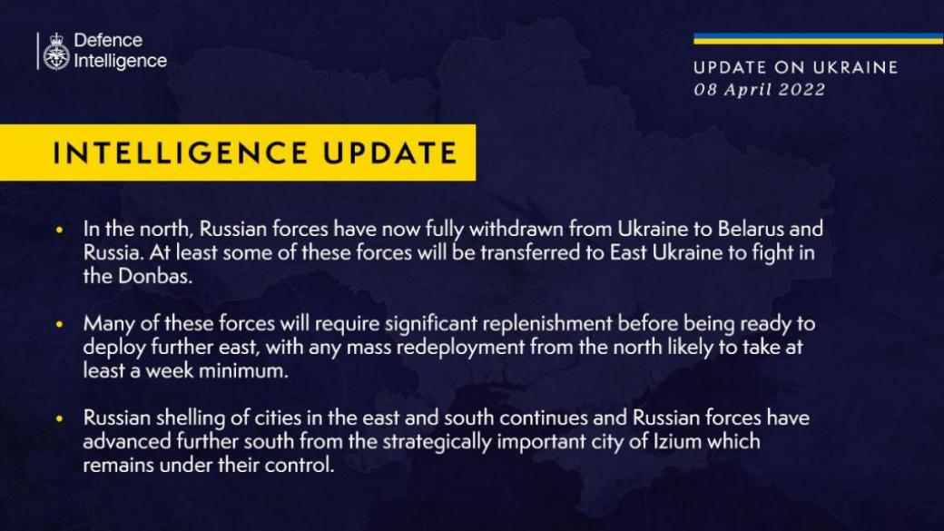 По данным Минобороны Британии, на севере Украины российские войска полностью выведены из Украины в Беларусь и Россию и часть этих сил будет переброшена на Восток Украины для боевых действий на Донбассе. В разведке добавили: