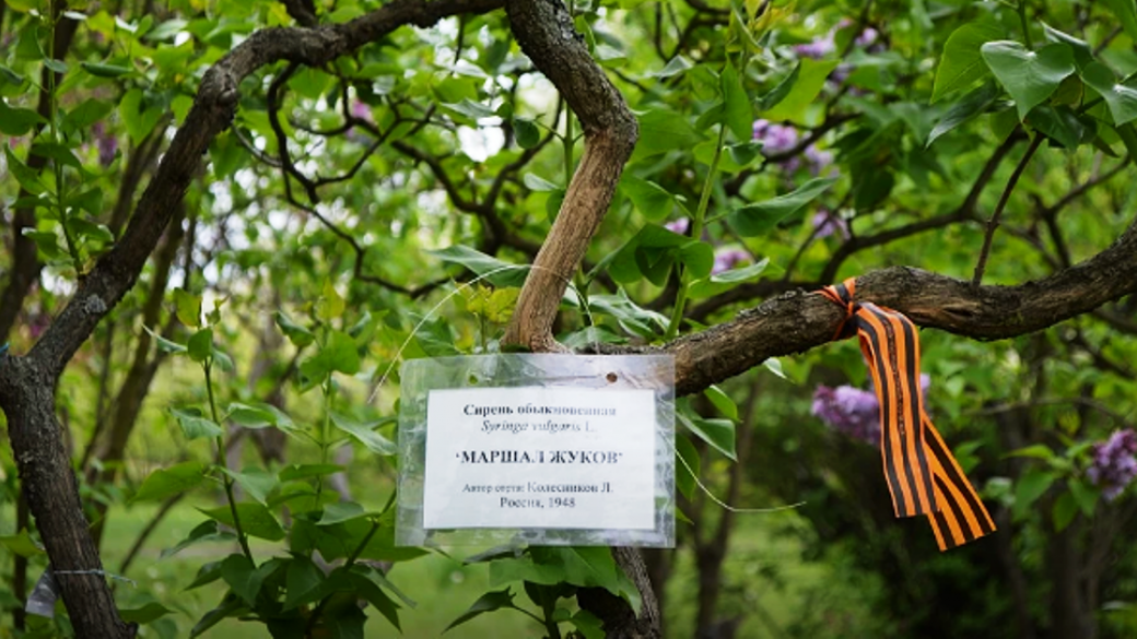 В ОРДО Донецком ботаническом саду к веткам сирени, названия которых посвящены победе в Великой Отечественной войне и ее героям, повязывают запрещенные в Украине георгиевские ленточки. Об этом сообщила куратор коллекции сирени Елена Виноградова.