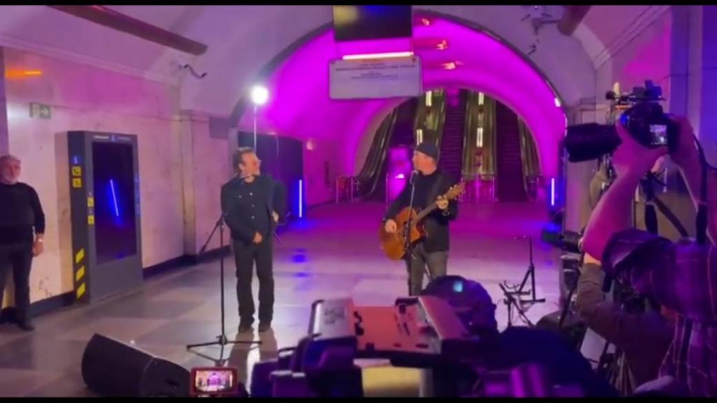 Сегодня на станции метро «Хрещатик» выступили легендарные Боно и Эдж из U2.