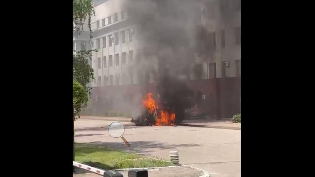 На опубликованном видео, горит автомобиль возле здания бывшего "Донбассэнерго", расположенного у входа в городской центральный парк.