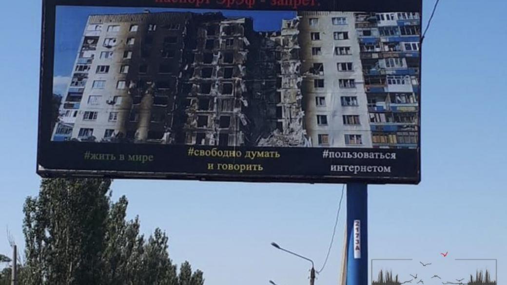Так, на билбордах на русском языке написано «Паспорт ЭрЭф — запрет: жить в мире, свободно думать и говорить, пользоваться интернетом, запрет на собрания».