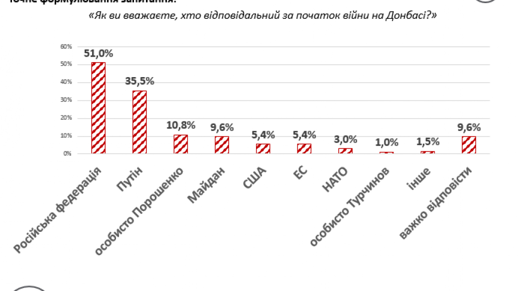 На вопрос: «Как вы считаете, кто ответственен за начало войны в Донбассе?», 51% респондентов назвали РФ, 35,5% - Путина, 10,8% опрошенных назвали бывшего президента Порошенко, 9,6% - события на Майдане, по 5,4% - США и ЕС, 3% - НАТО, 1% - лично Турчинова.