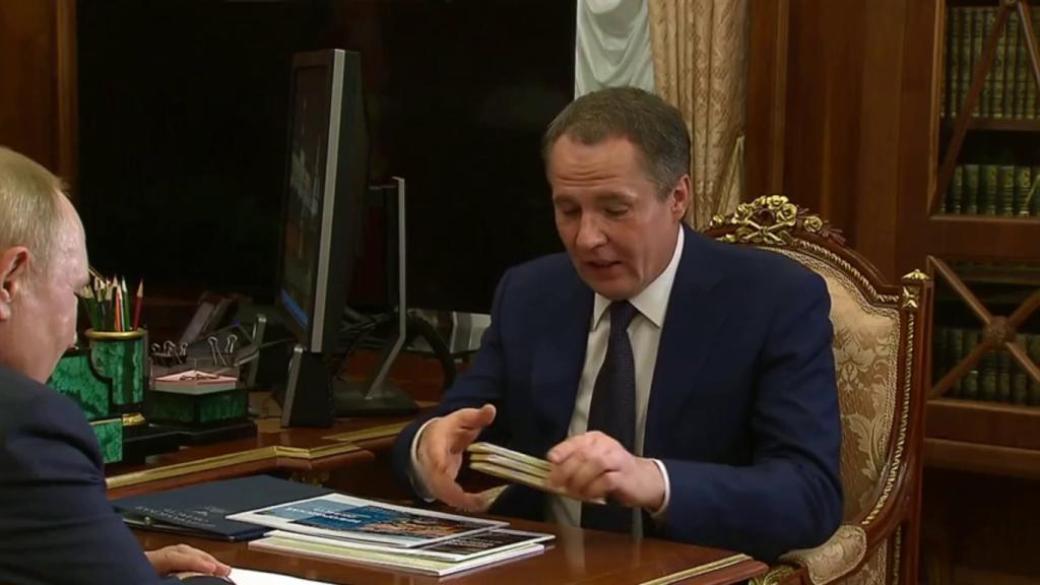 При встрече губернатор Белгородской области подарил Путину три плитки шоколада, рассказав при этом "трогательную" историю, о том, как в одном из населенных пунктов Белгородской области ребенок-первоклассник выходит на трассу встречать колонны с военной техникой российских оккупантов идущих на войну с Украиной.