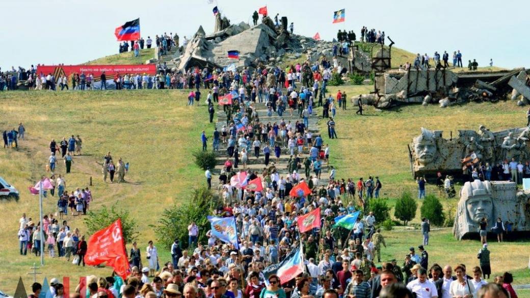 Боевики «ДНР» заявили о том, что жители оккупированной группировкой территории Донецкой области в канун Дня освобождения Донбасса «собрались на месте разрушенного в ходе боев 2014 года мемориального комплекса Саур-Могила, чтобы почтить память героев-освободителей».