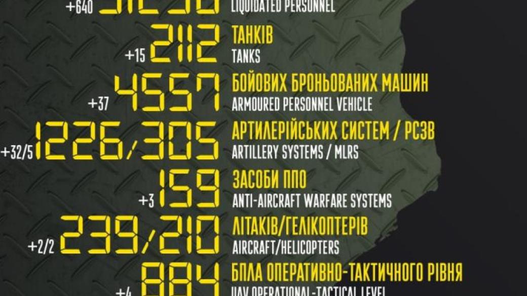 С начала полномасштабного вторжения войск РФ в Украину общие боевые потери противника с 24.02 по 08.09 составили около 51250 (+640) человек личного состава. Об этом сообщает Генштаб ВСУ.