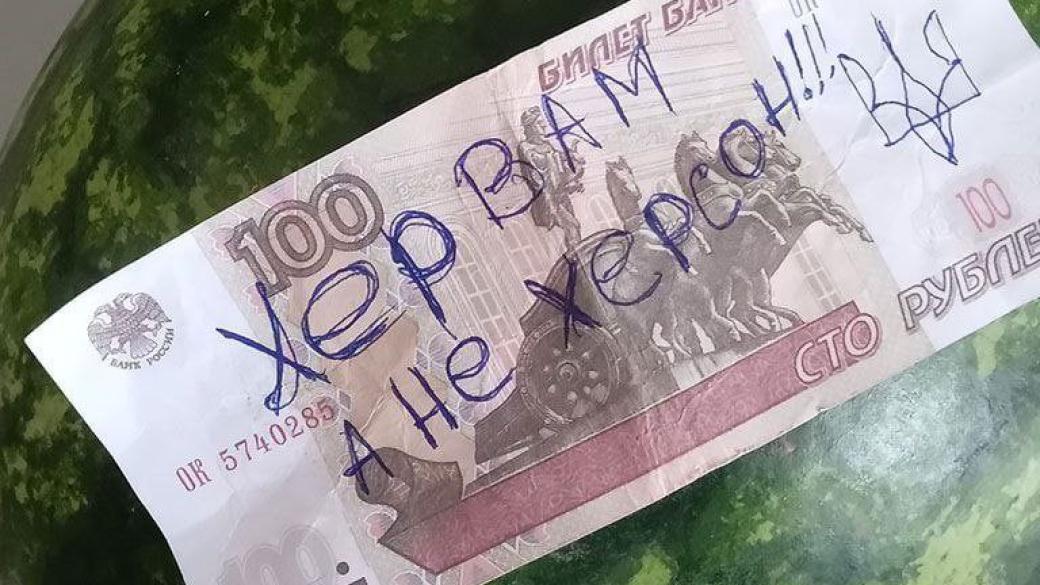 По данным венных, украинцы пишут на рублях - "Фашисты", "Слава Украине! Героям слава!", "Смерть оккупантам", "Крым - это Украина" и даже "Х*р вам, а не Херсон!".