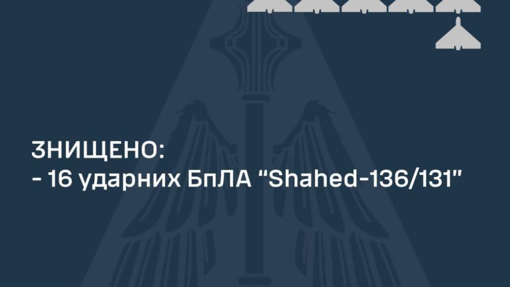 "Всего зафиксированы пуски 20 "Шахедов". Все – в направлении Одесской области. В результате боевой работы уничтожено 16 "шахедов". Их сбили в Одесской и Николаевской областях".