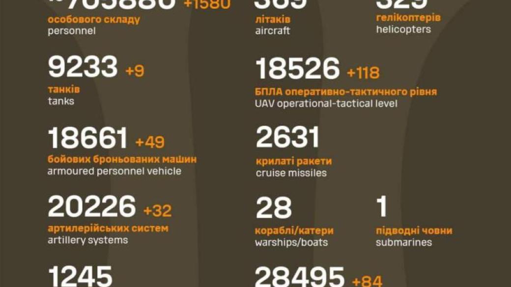 За прошедшие сутки ВСУ ликвидировали 1 580 оккупантов и практически 300 единиц вражеской техники.