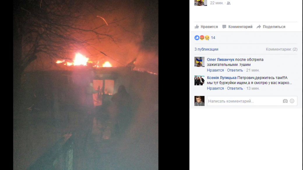 Руководитель военно-гражданской администрации Красногоровки Олег Ливанчук на своей странице в соцсети сообщил: «После обстрела зажигательными. Гасим».