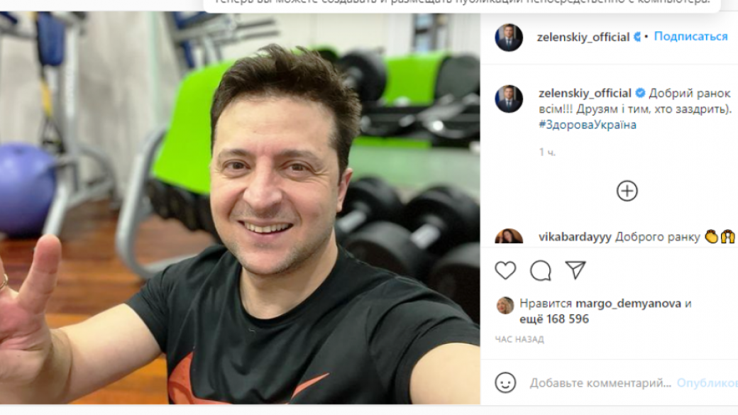 Президент Украины Владимир Зеленский опубликовал на своей странице в Инстаграмм новое фото с тренировки в спортивном зале и в комментарии к нему пожелал доброго утра своим «завистникам».