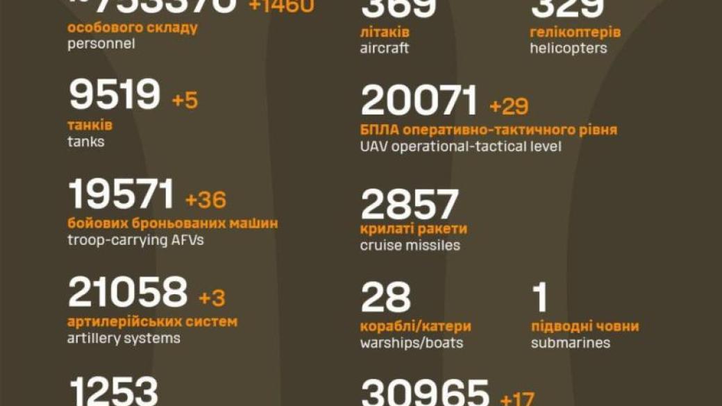 За минувшие сутки ВСУ уничтожили 1460 оккупантов и десятки единиц техники и вооружения агрессора.