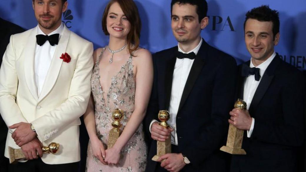 Режиссер фильма «Ла-Ла Ленд» Демьен Шазелл получил награду за лучшую режиссуру и сценарий. Актер Райан Гослинг получил награду в номинации «лучший актер в комедии или мюзикле» за роль в этом фильме. Его напарница по фильму Эмма Стоун получила Золотой глобус как «лучшая актриса комедии или мюзикла». Американский композитор Джастин Гурвиц получил два Золотых глобуса за музыку к «Ла-Ла Ленд» и песню «City Of Stars» к этому же фильму. «Ла-Ла Ленд» также выиграл в номинации «лучшая комедия или мюзикл».
