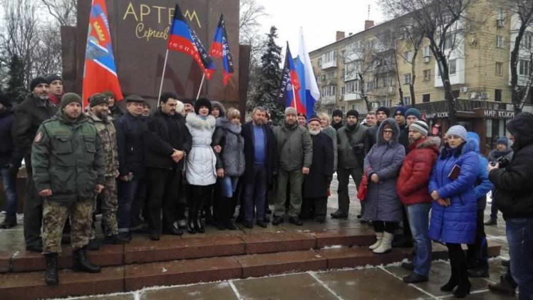 В оккупированном Донецке экс-главари «ДНР» Александр Ходаковский, Андрей Пургин и другие сторонники «русского мира» принесли цветы к памятнику советскому революционеру Федору Сергееву — Артему, который был автором идеи Донецко-Криворожской советской республики.