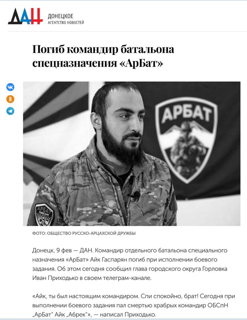 ВСУ ликвидировали на фронте командира батальона "АрБат" Айка Гаспаряна. Это бывший наемник ЧВК "Вагнер", уголовник и военный преступник, которого за убийства украинцев награждал путин. Его, как и тысячи других заключённых, вывели из колонии для участия в боевых действиях. Об этом сообщает Диалог.