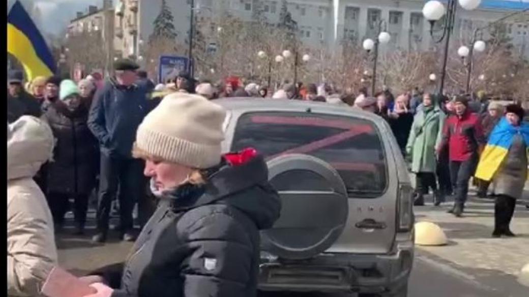 В Бердянске люди уже несколько дней выходят на главную площадь города в 12 часов, что бы показать российским захватчикам, что Бердянск, это Украина, что местные жители не рады видеть оккупантов на своей земле. Далее бердянцы колонной идут на Приморскую площадь к легендарной ротонде.