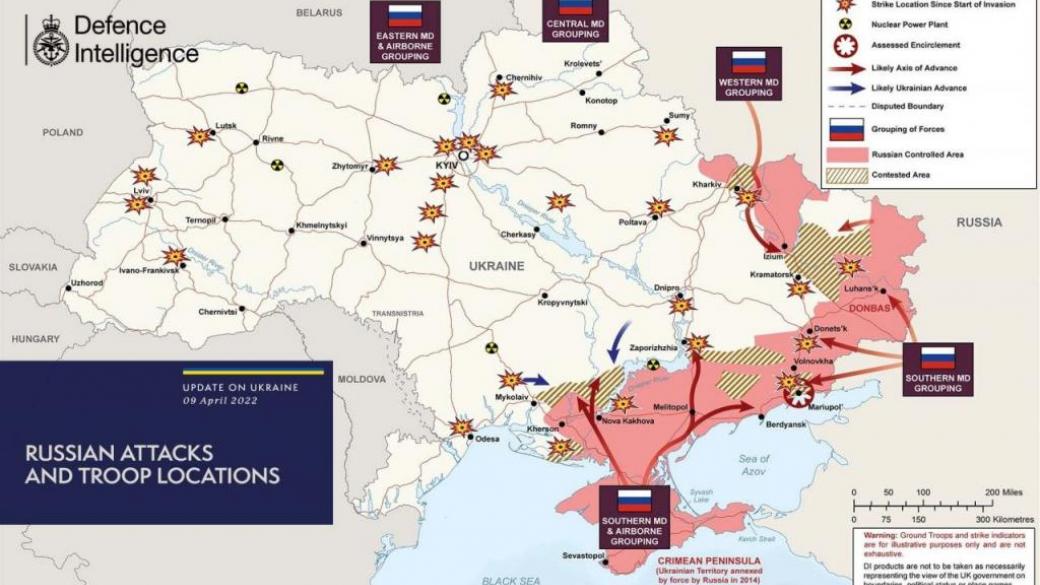 В британской разведке опубликовали карту боевых действий в Украине по состоянию на 9 апреля.