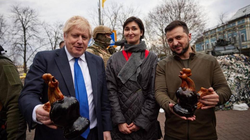 Во время прогулки по центру Киева Борис Джонсон и Владимир Зеленский получили в подарок от девушки статуэтки глиняных петухов.