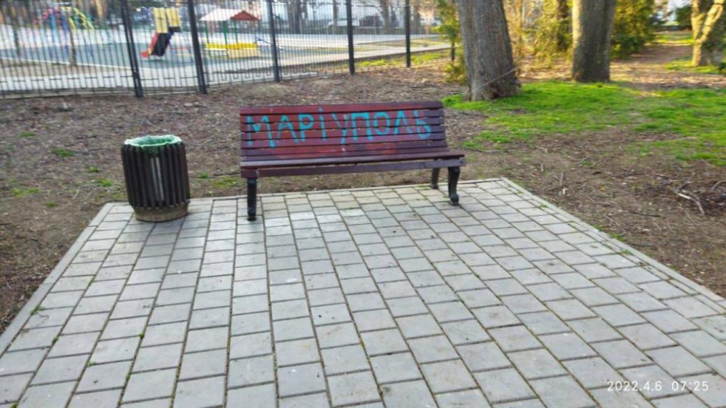 В Севастополе неизвестные на лавочках в парке написали названия украинских городов, где российскими военные совершили массовые военные преступления против мирных жителей.