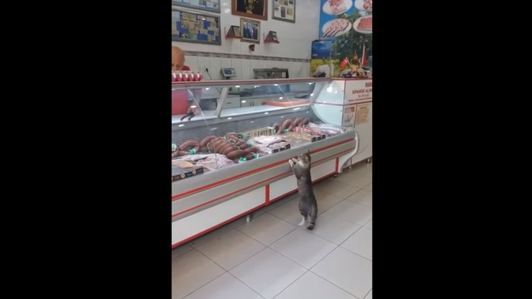 В сеть выложили видео, в котором кот стоит в мясном отделе в супермаркете и выбирает себе лакомство.