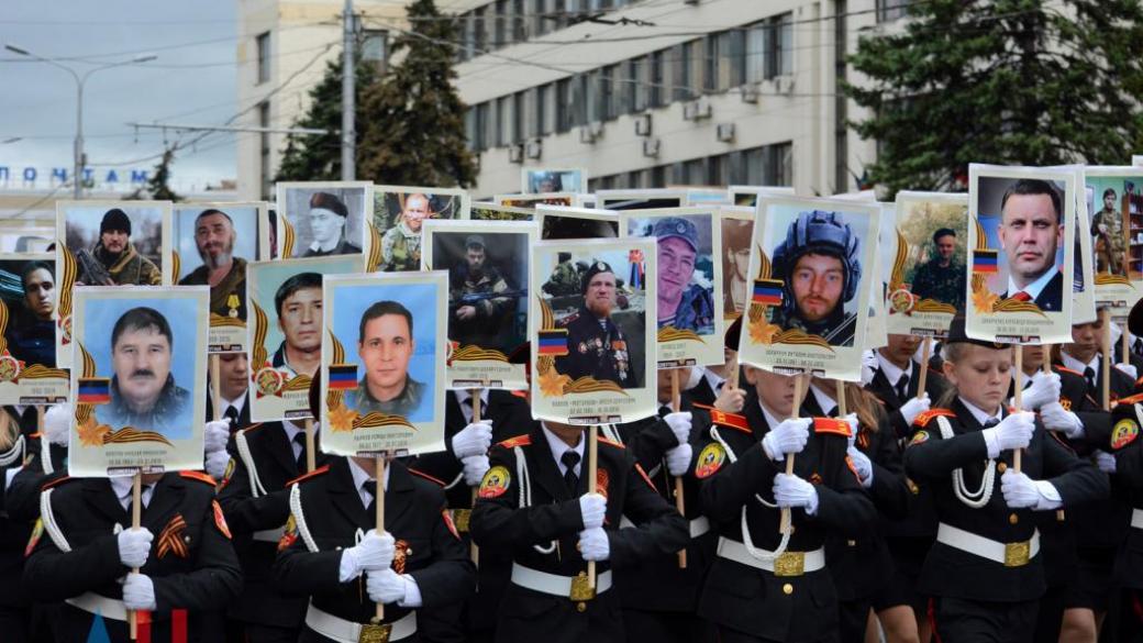 В первых рядах шествия пронесли портрет убитого экс-главаря ОРДО Александра Захарченко пронесли его сыновья. Также в колонне «Бессмертного полка» фотографии убитых членов НВФ Михаила Толстых (Гиви) и Арсена Павлова (Моторола).