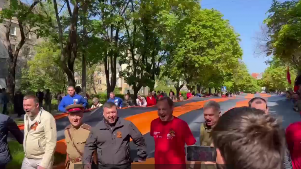 По информации ресурсов, это самая большая в мире Георгиевская лента. Участники колонны вместе с так называемым «главой ДНР» Денисом Пушилиным пронесли ее до монумента «Воину-освободителю Донбасса», скандируя «Ура».