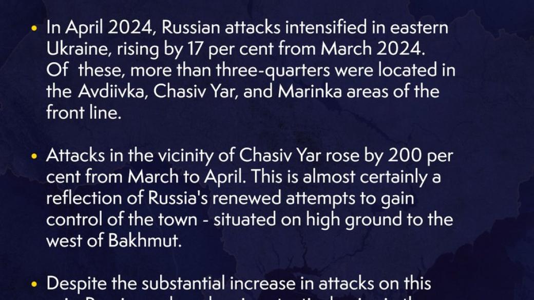В ведомстве добавили, что в апреле 2024 года российские атаки на востоке Украины усилились, увеличившись по сравнению с мартом 2024 года на 17%: