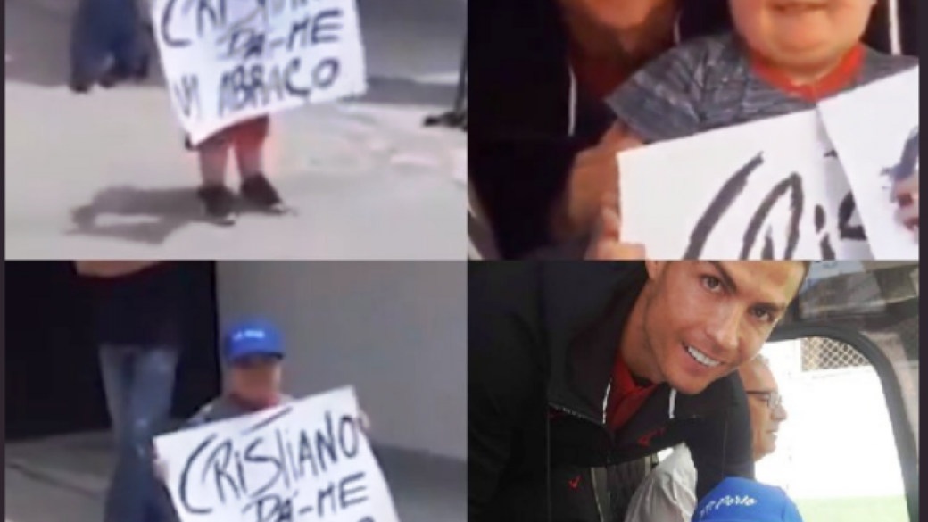 Как отмечают на странице Роналду в соцсети, после субботней тренировки футболисты португальской команды возвращались в отель и Роналду увидел из окна 11-летнего мальчика с плакатом: Cristiano Ronaldo dame un abrazo («Криштиану Роналду, обними меня»).