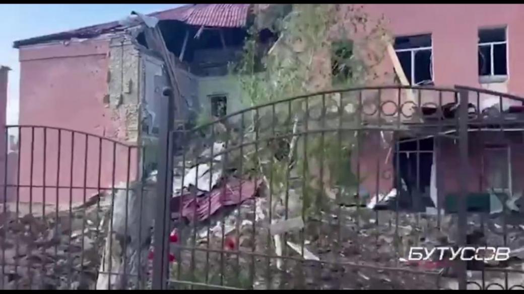 «Вот, одна из школ села Горское, в результате попадания авиабомбы. школа почти полностью разрушена», сказал журналист.