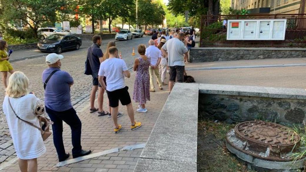 В воскресенье, 9 августа, в Киеве у посольства Беларуси собралась очередь из желающих проголосовать на выборах президента. Об этом сообщает TUT.by.