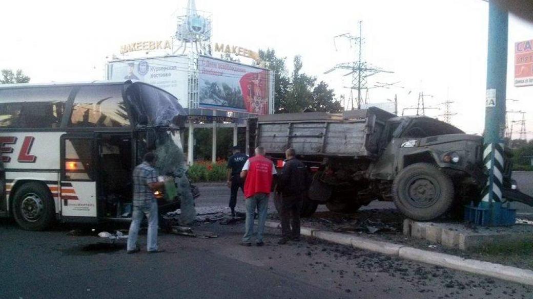 Сегодня утром на Чайкинском кольце в оккупированной Макеевке Донецкой области грузовик столкнулся с пассажирским автобусом.
