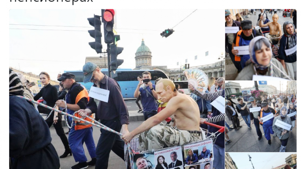 Так, во время акции человек в маске Путина ездил по улицам Петербурга в тележке из супермаркета, которую везли на себе российские пенсионеры. Во время поездки «Путин» погонял пенсионеров хлыстом и призывал работать, разбрасывая по улице мелкие монеты.