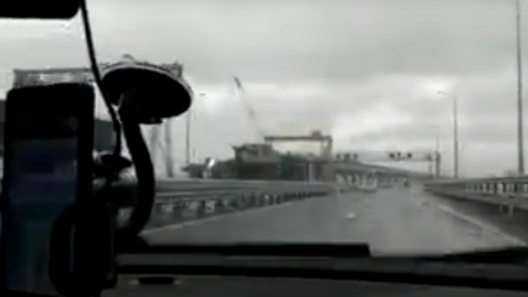 Очевидцы выложили в сеть новое видео с места столкновения плавучего крана с опорой автодорожной части Крымского моста, снятое на видеорегистратор автомобиля.