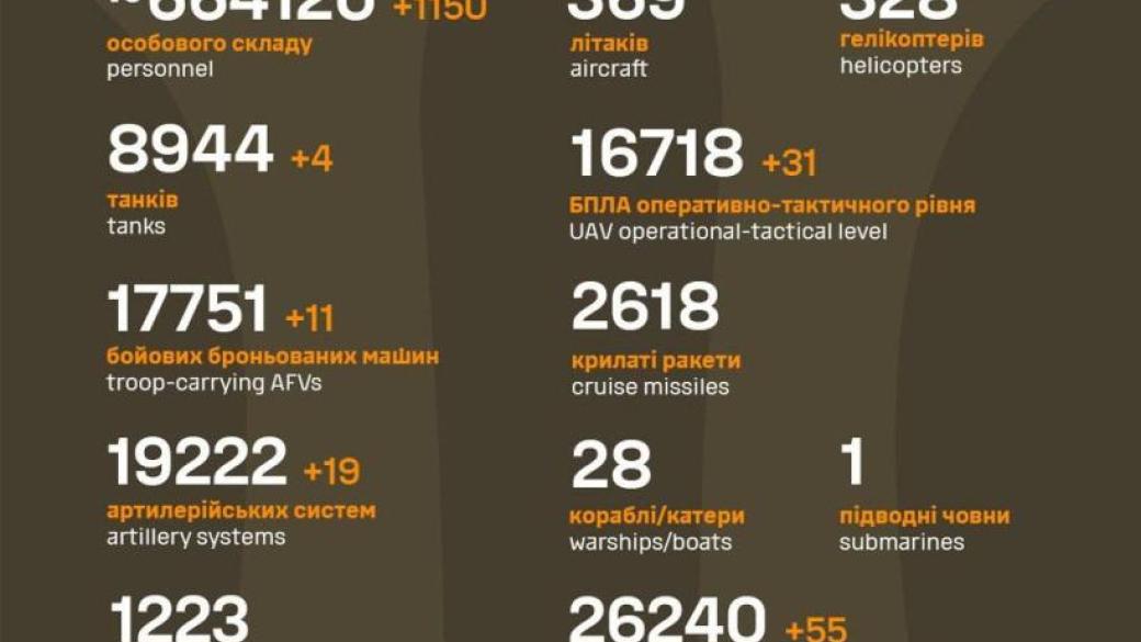 За минувшие сутки оккупанты потеряли на фронте в Украине 1 150 военных и десятки единиц техники.