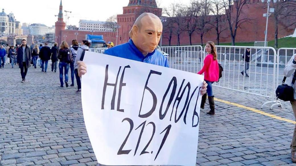 36-летний активист не менее 10 раз был задержан правоохранителями, когда он ходил по центру Москвы в маске Путина с плакатом, на котором было написано «Не боюсь 212.1».