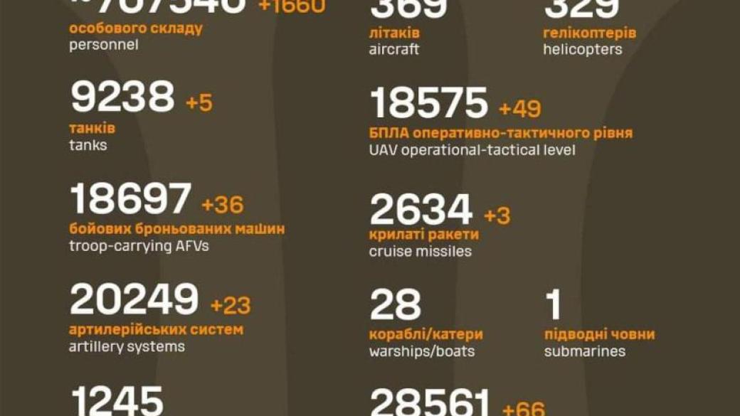 За прошедшие сутки украинские защитники ликвидировали 1660 оккупантов и уничтожили более 180 единиц вражеской техники.
