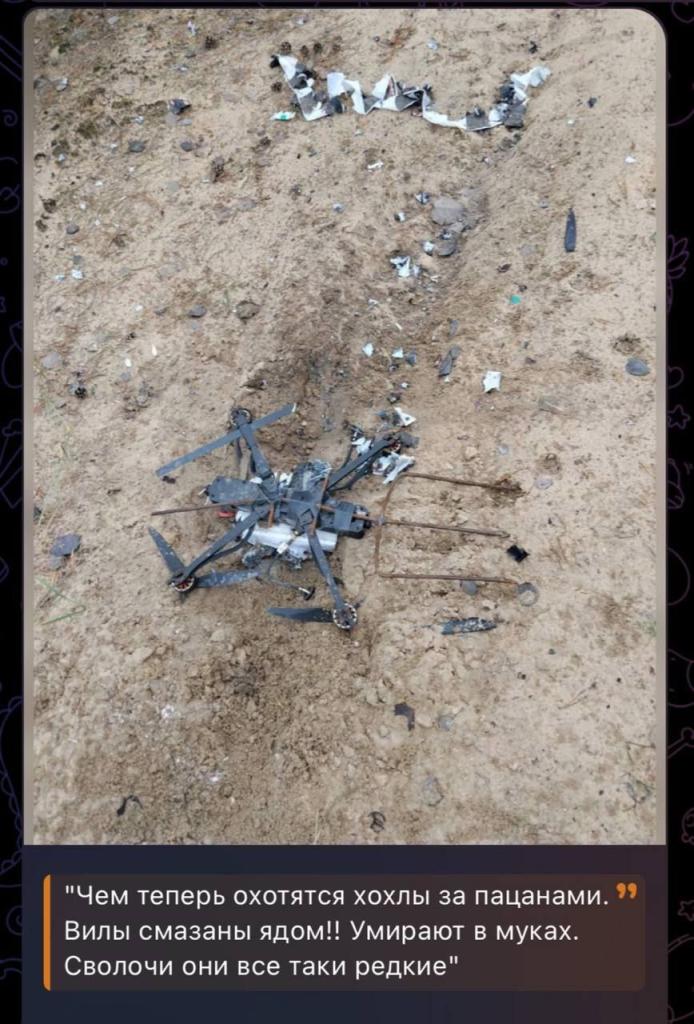 В российских пабликах оккупанты жалуются на новую "подлость" украинских военных. Якобы бойцы ВСУ начали цеплять на дроны вилы, смазанные ядом, после которого раненые военных рф "умирают в страшных муках". Соответствующие кадры опубликованы в ряде российских Телеграмм-каналах.