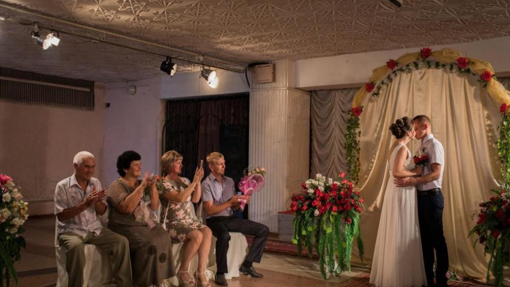 «Этим летом Алина и Игорь Лещина целуются во время свадебной церемонии в общественном центре, расположенном рядом с минным полем, в Авдеевке, Украина», — сказано в подписи к фотографии.