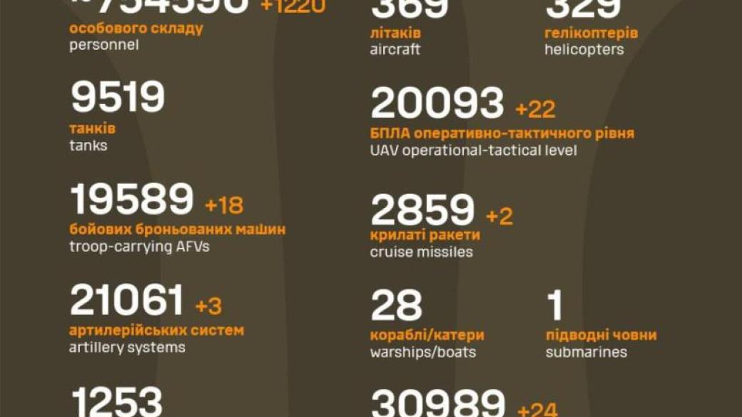 За минувшие сутки Силы обороны ликвидировали 1220 российских захватчиков и уничтожили десятки единиц вражеской техники и вооружения.