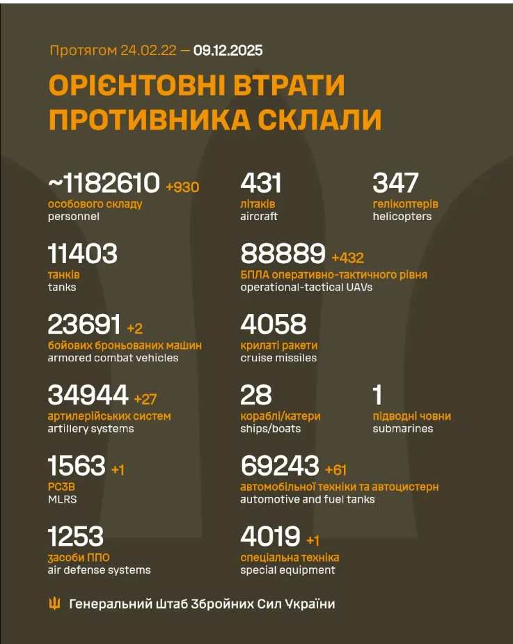 Статистика Генштаба ВСУ: потери армии рф на 6 декабря