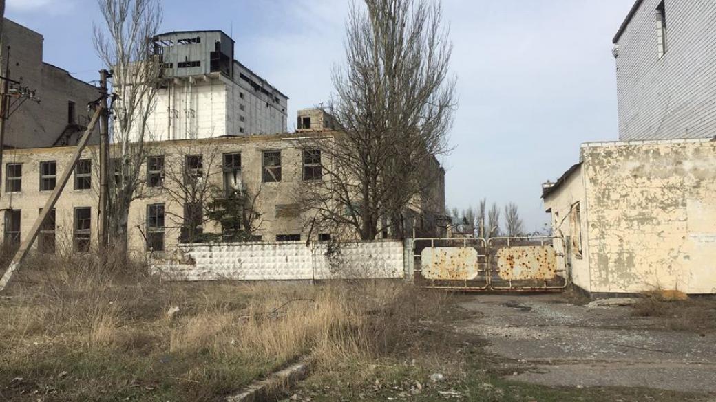 На фото показаны строения, в которых из-за попадания снарядов, отсутствуют окна, часть стен, а также, видны административные здания, которые из-за боевых действий давно пустуют.