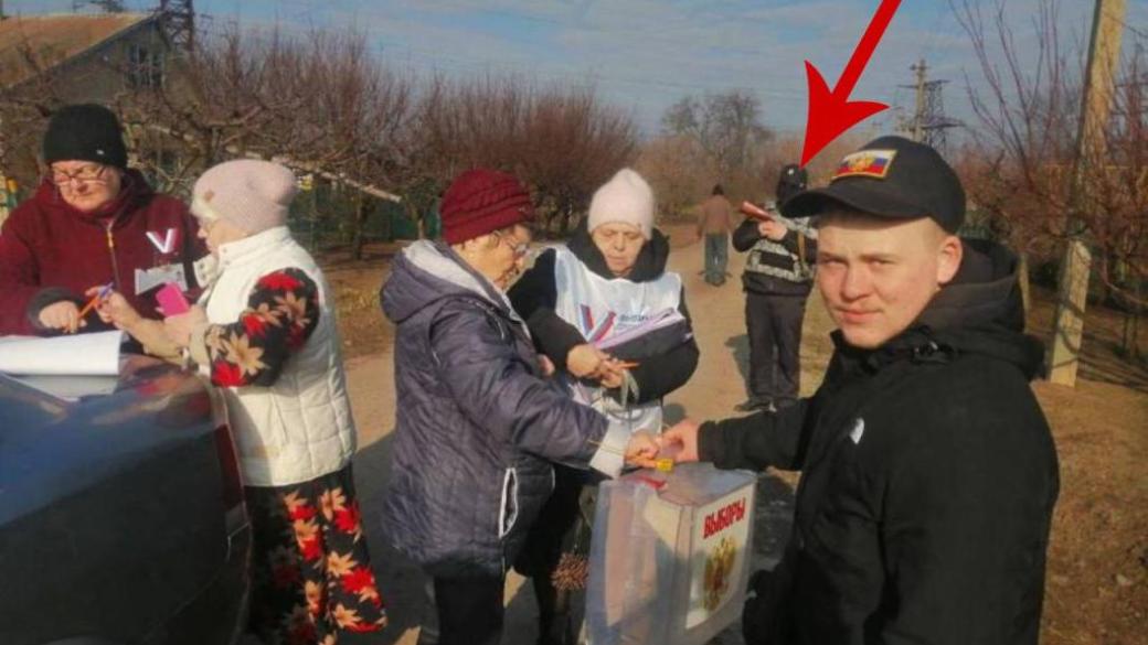 А тепер уважно подивіться на чоловіка на задньому плані фото пропагандистів. Людина зі зброєю з замотаним обличчям - то, рашистський, так би мовити «мотиватор».Якщо комусь в голову прийде думка не проголосувати - відразу на перший план виходе опудало з ружбайкою🤬