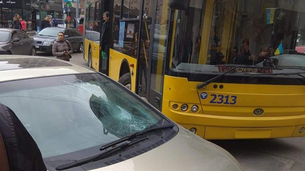 Сегодня в Киеве на Майдане Независимости пассажиры общественного транспорта разбили стекло легковому автомобилю, который заблокировал движение троллейбусов.