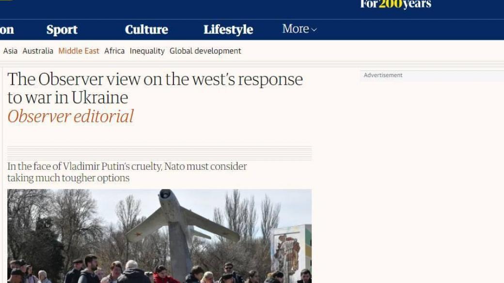 Редакционная статья в The Guardian упрекает НАТО в трусости и требует вмешаться в конфликт в Украине прямым военным участием