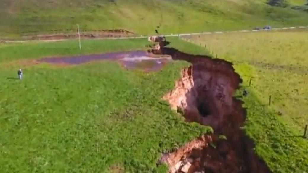 Это произошло в это на Северном острове недалеко от города Роторуа. Гигантская трещина в 30 метров шириной и 20 метров глубиной простирается на 200 метров. Местных фермеров это сильно удручает, так как закопать ее когда-либо просто не проставляется возможным. По этой причине провал в почве пока просто огораживается, чтобы никто в него не свалился.