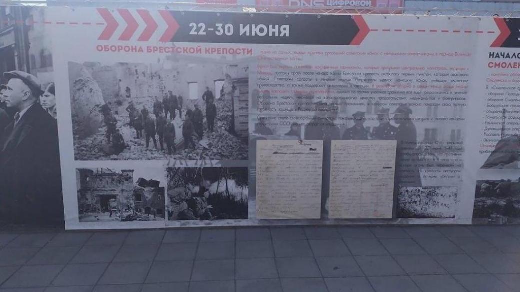 Баннер, посвященный обороне Брестской крепости, расположен напротив Дома офицеров. На нем вместо красноармейцев изображены немецкие солдаты на руинах.